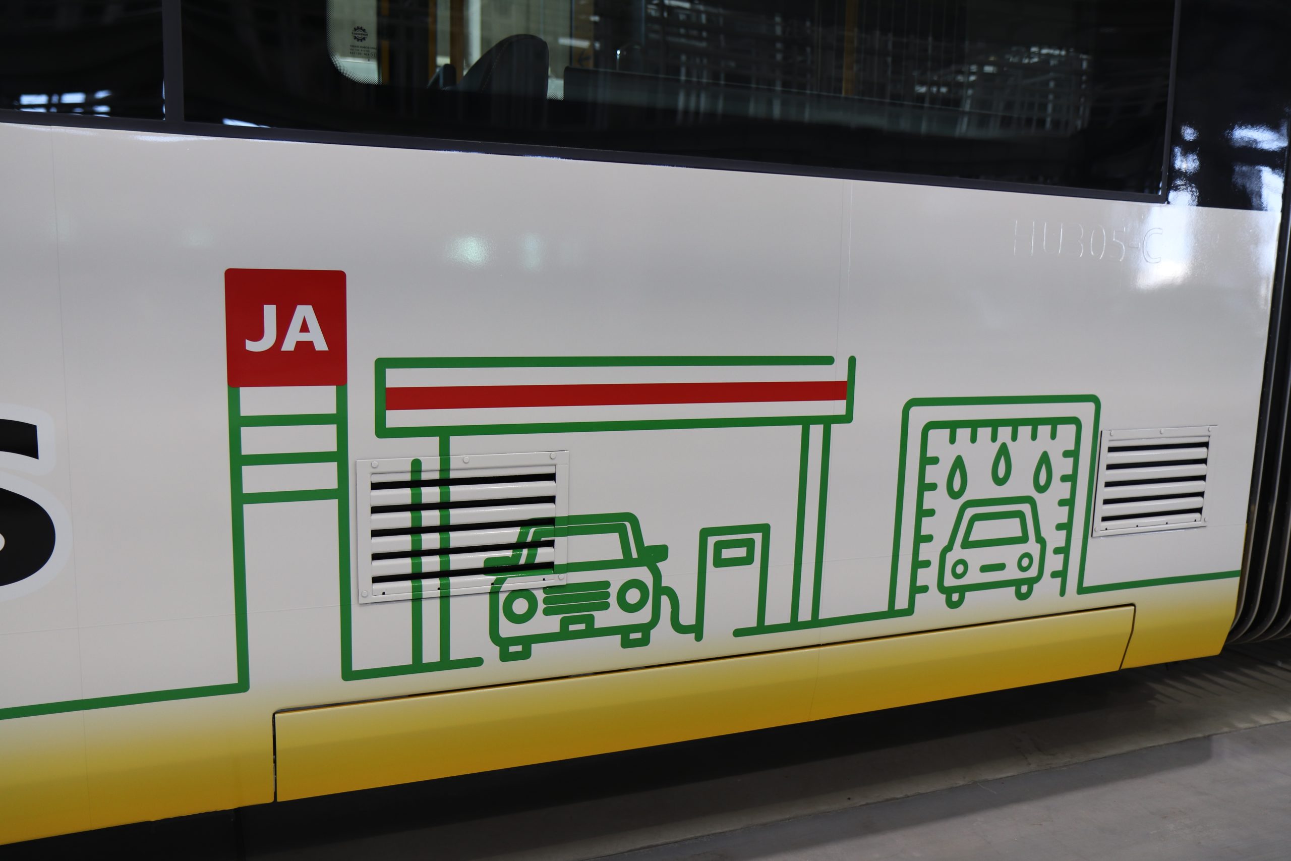 民間企業初の企業広告ラッピングLRTとなっており、当社の社名や事業ロゴが大きく描かれています。