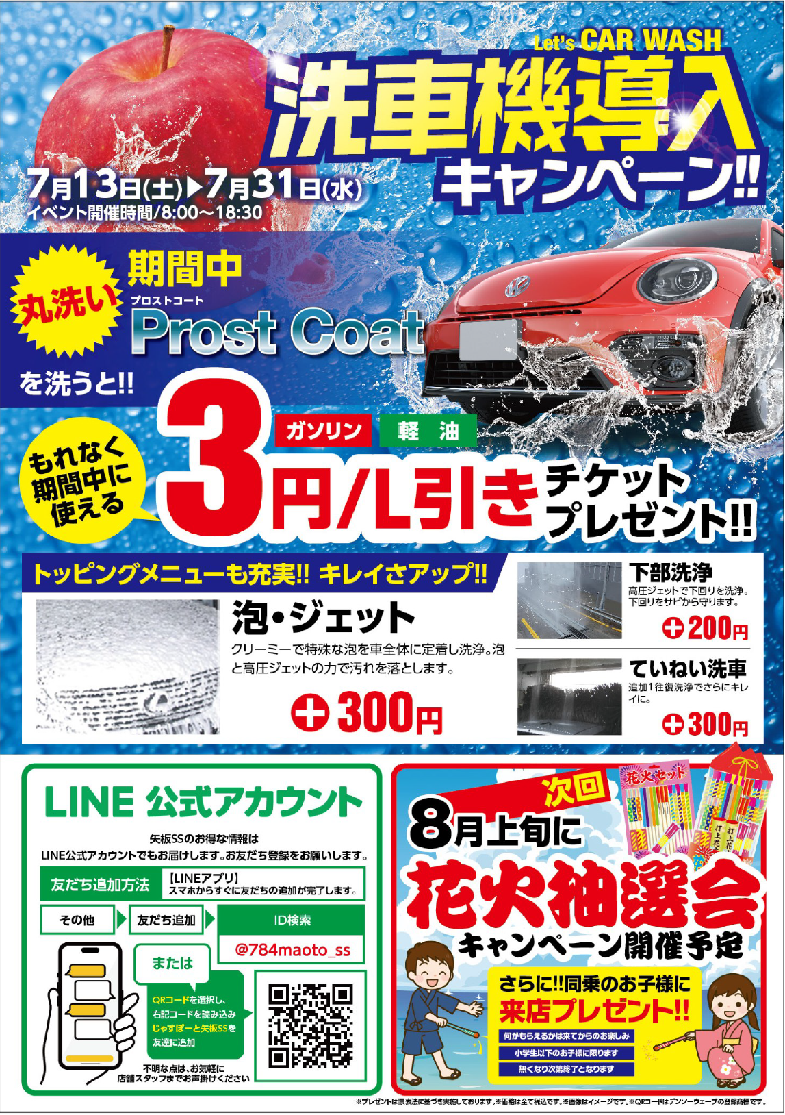 矢板SSにて「洗車機導入キャンペーン」を7月13日(土)~7月31日(水)の期間で実施いたします!