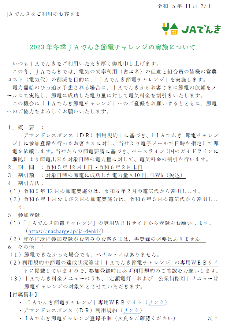 2023年冬季JAでんき節電チャレンジの実施について