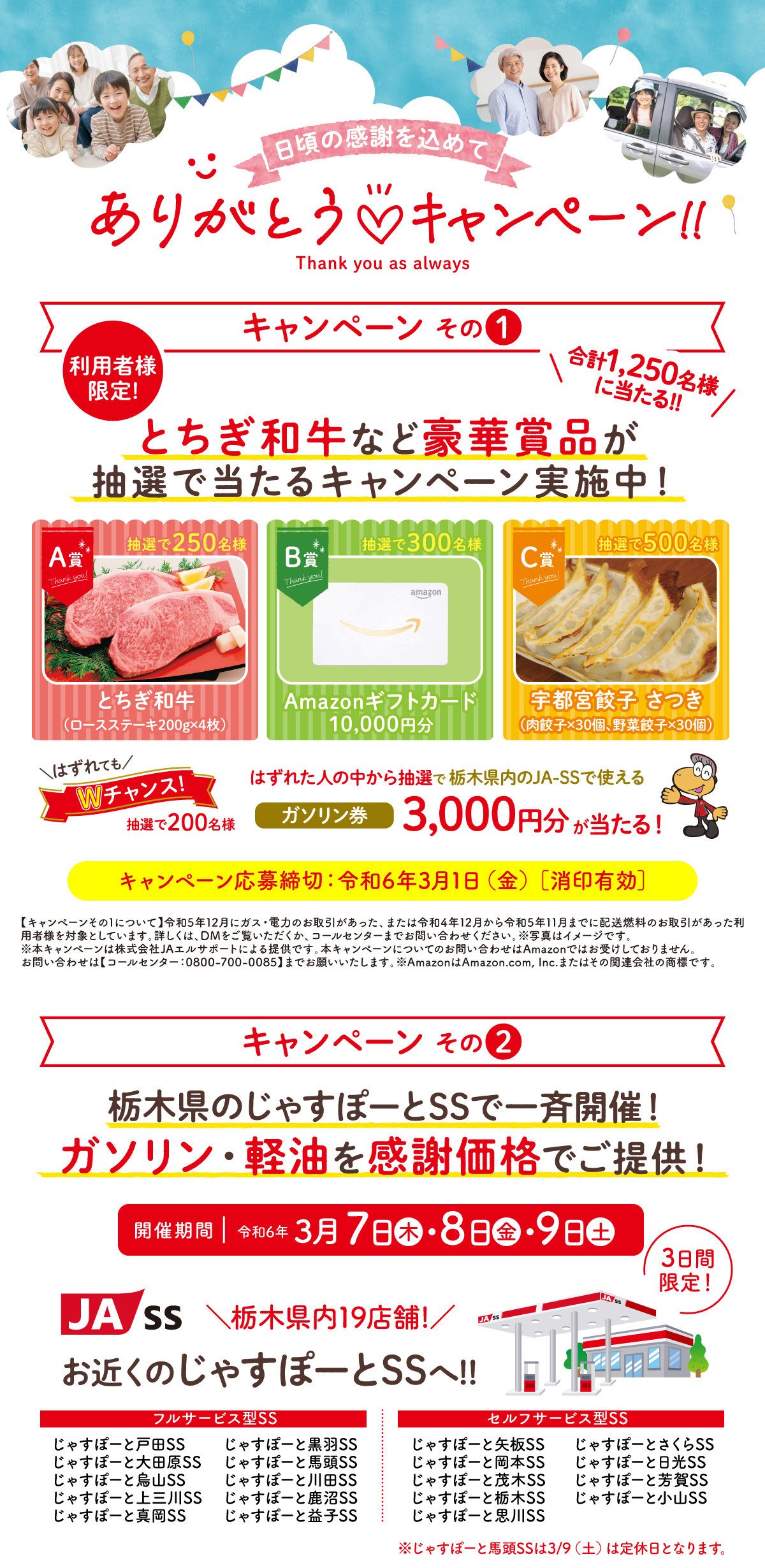 キャンペーンその2 栃木県のじゃすぽーとSSで一斉開催! ガソリン・軽油を感謝価格でご提供させていただきます! 開催期間:令和6年3月7日(木)・8日(金)・9日(土)3日間限定!