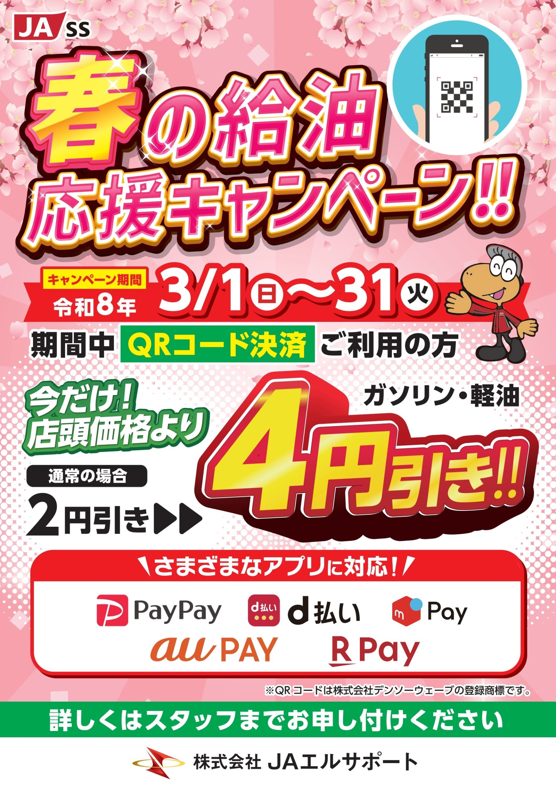 日頃よりじゃすぽーとSSをご利用いただき誠にありがとうございます。 この度じゃすぽーとSS全店舗で「春の給油応援キャンペーン!!」を開催いたします。