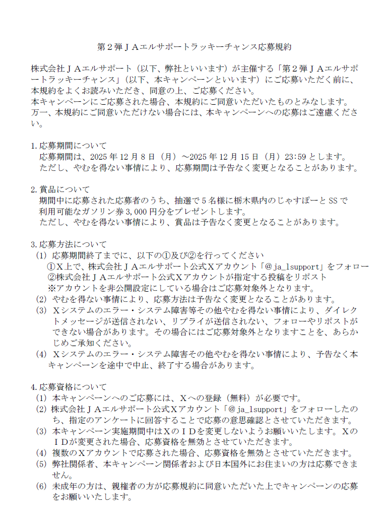 この度、当社公式Xにて「第2弾JAエルサポートラッキーチャンス 」を開催いたします!