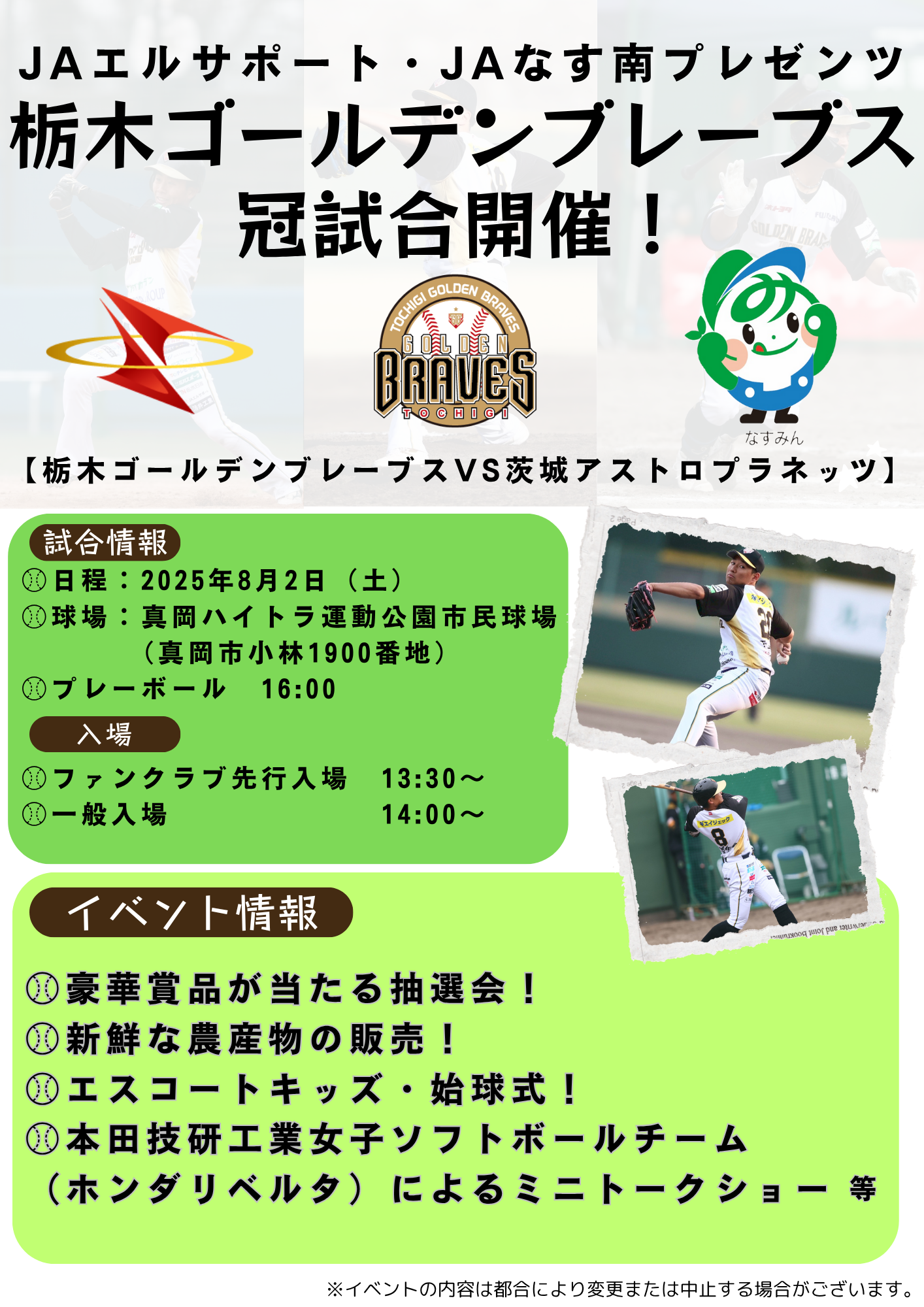 8/2(土)JAエルサポート・JAなす南プレゼンツ 栃木ゴールデンブレーブス冠試合開催!⚾