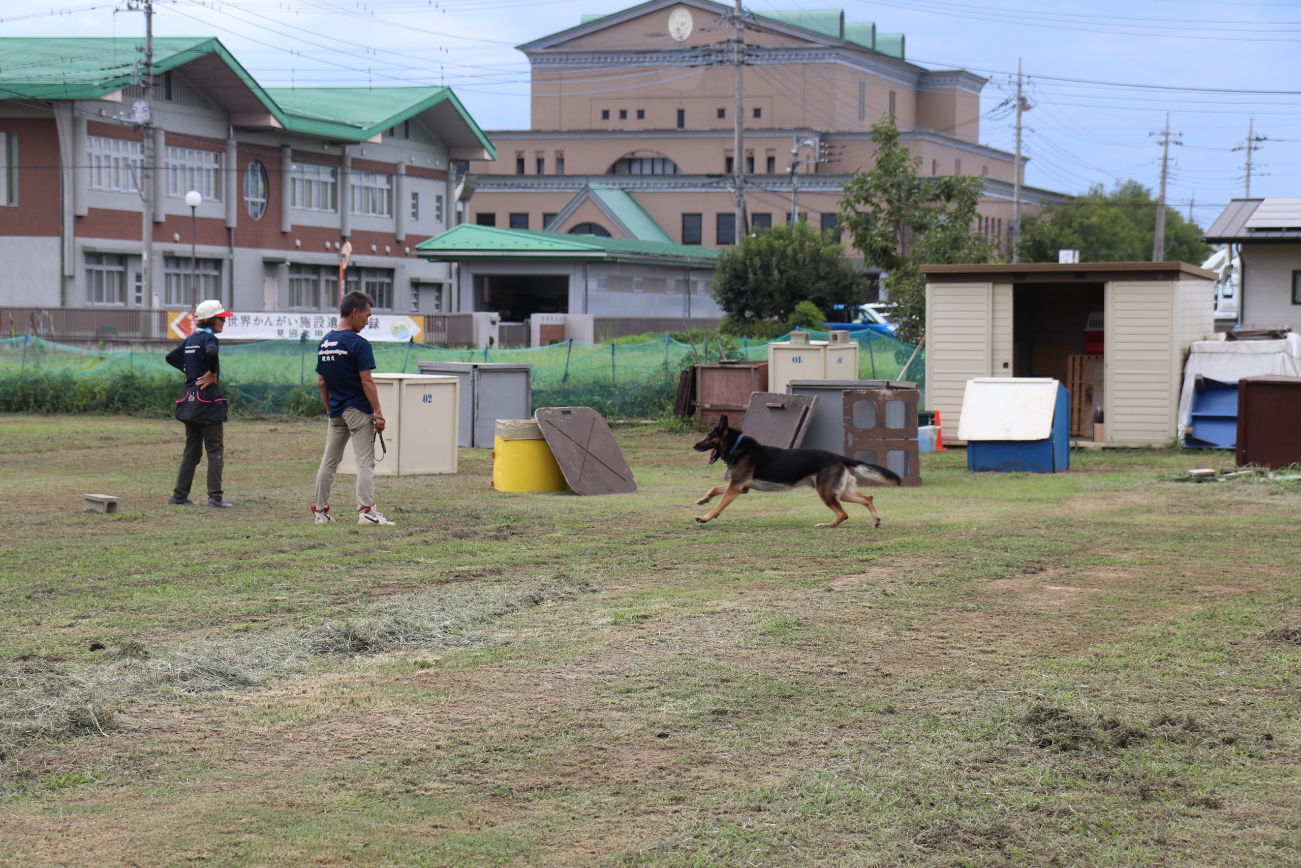 研修前半では、救助犬が日頃訓練をしている場所や実際の訓練の様子(障害物の中に隠れている人をにおいを頼りに探す訓練)などを見学しました。