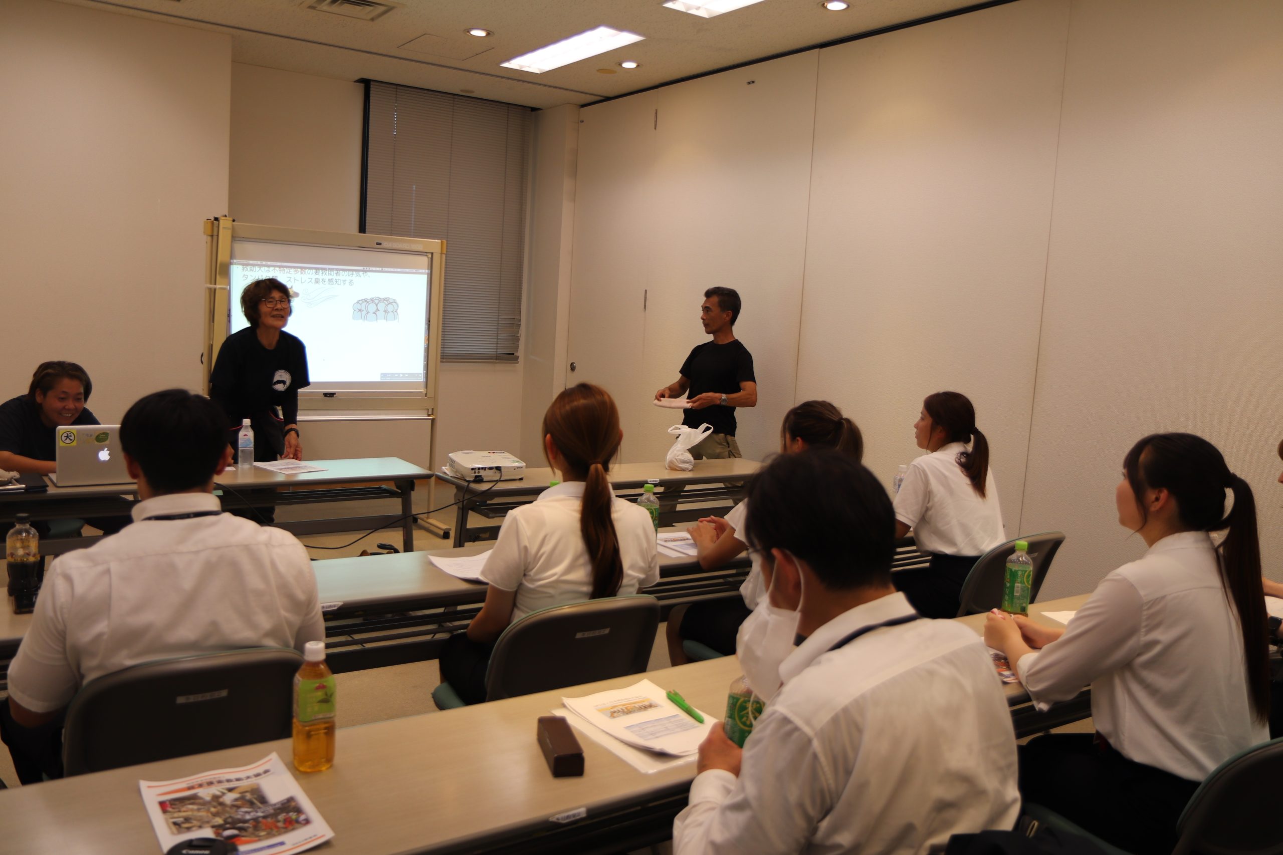 研修を受けていた若手社員たちは真剣な面持ちで当時の話を聞き、日本捜索救助犬協会の取組みを学んでいました。